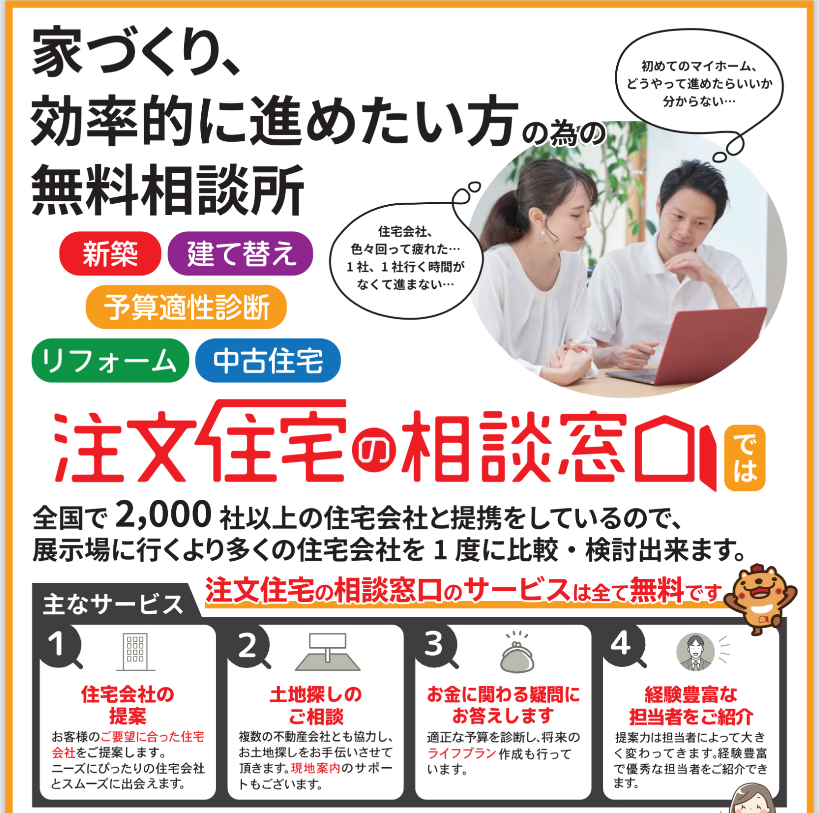 注文住宅の相談窓口は、家づくりに関するさまざまな悩みを解決するために誕生しました。